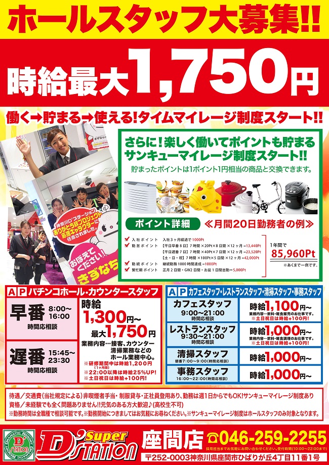 2016.10.27 Super D'STATION 座間店 店舗からのご案内 Super D’STATION 座間店で一緒に働きましょう!未経験の方も大歓迎!アルバイトご希望の方はお電話下さい。 D’STATIONグループは、若い人材が中心となり、楽しみながらやりがいを持って働ける職場です♪ 前の記事 次の記事 一覧へ戻る