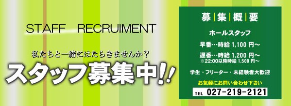 アルバイトご希望の方は、お電話、または、下記お問い合わせフォームの「店舗選択」より「前橋若宮店」をご選択下さい。