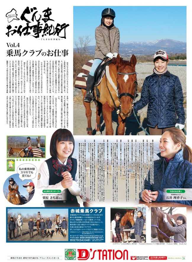 2014.07.23 サステナビリティ ぐんまお仕事紀行とは?D’STATIONのスタッフが地元群馬で働くプロフェッショナルな方々に実際にお会いし、その仕事ぶりをインタビューと体験取材で紹介する、群馬の元気発信企画です! 第4回目は、乗馬クラブのお仕事です♪ ↓記事クリックで拡大表示されます。 前の記事 次の記事 一覧へ戻る